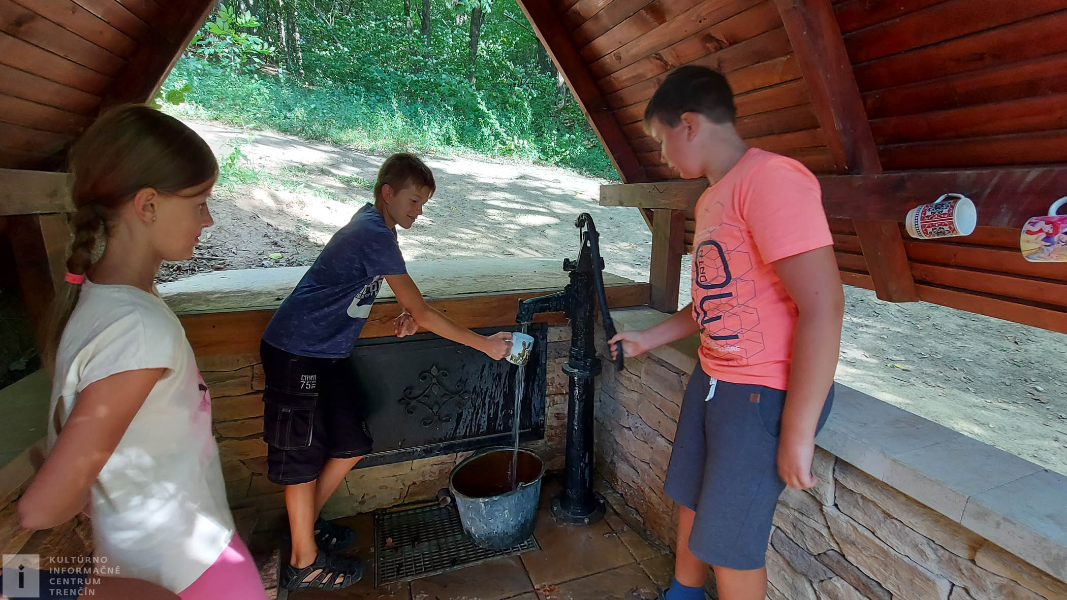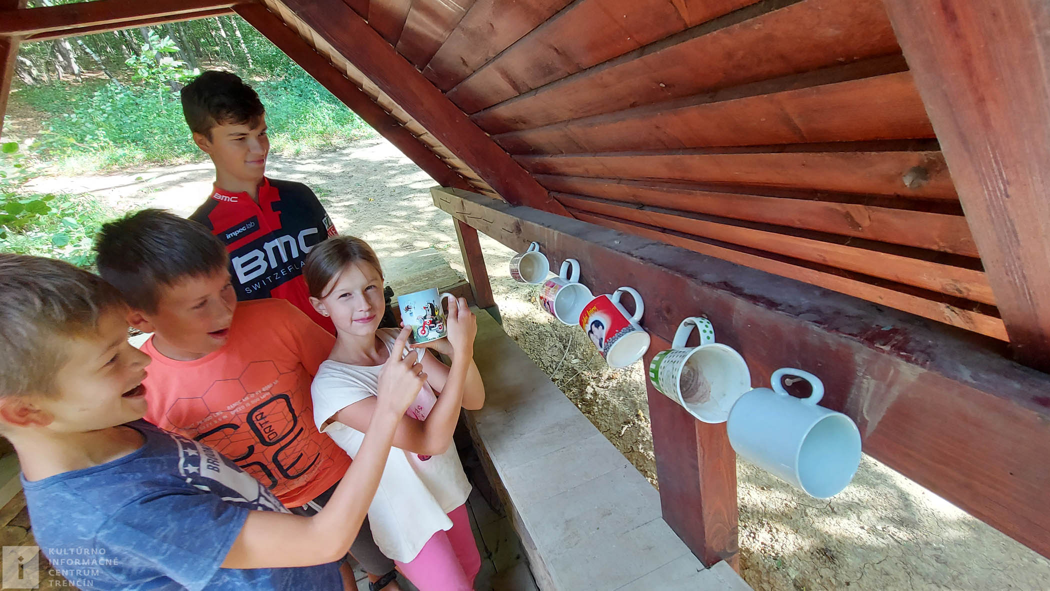 Pod prístreškom nás milo prekvapili nachystané hrnčeky, kde si môže každý vybrať, s akého hrnčeka sa napije chutnej kyslej vody. Takže odpustíme trochu kyselky a koštujeme, aká je. No jednoducho výborná, zaslúžime si dobre sa napiť.