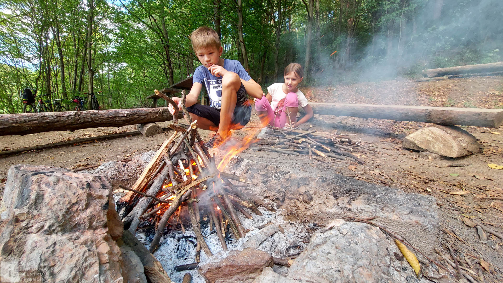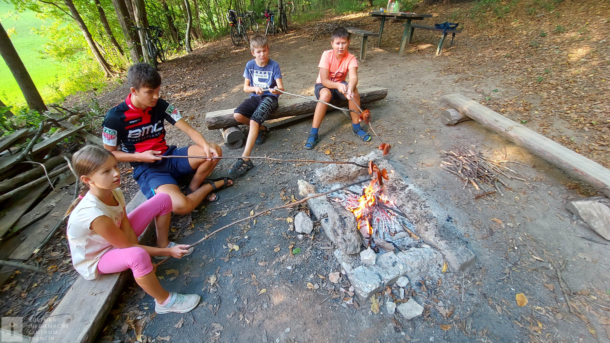 Mladší cykloturisti sa veľmi tešia, že si opečieme špekačku a posilníme sa. Tak šup do lesa na suché drevo a založíme si v ohnisku poriadny ohník. Palice na opekanie sú tu už nachystané od predchádzajúcich opekačov, tak len napichneme a už si opekáme.