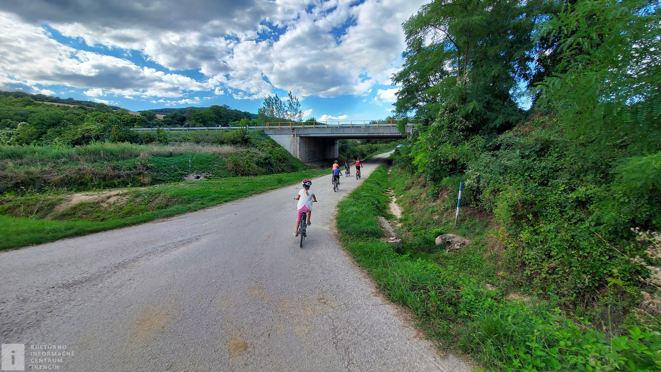 Dostávame sa do Zlatoviec a odbočujeme na križovatke s hlavnou ulicou doprava. Opúšťame obývané štvrte mesta a krútime si veselo pedálmi. Na najbližšej odbočke odbočujeme doprava popod diaľničný most. Nasleduje mierny kratší stupáčik. Nie všetci zvládnu sa na bajku vyviesť až hore.