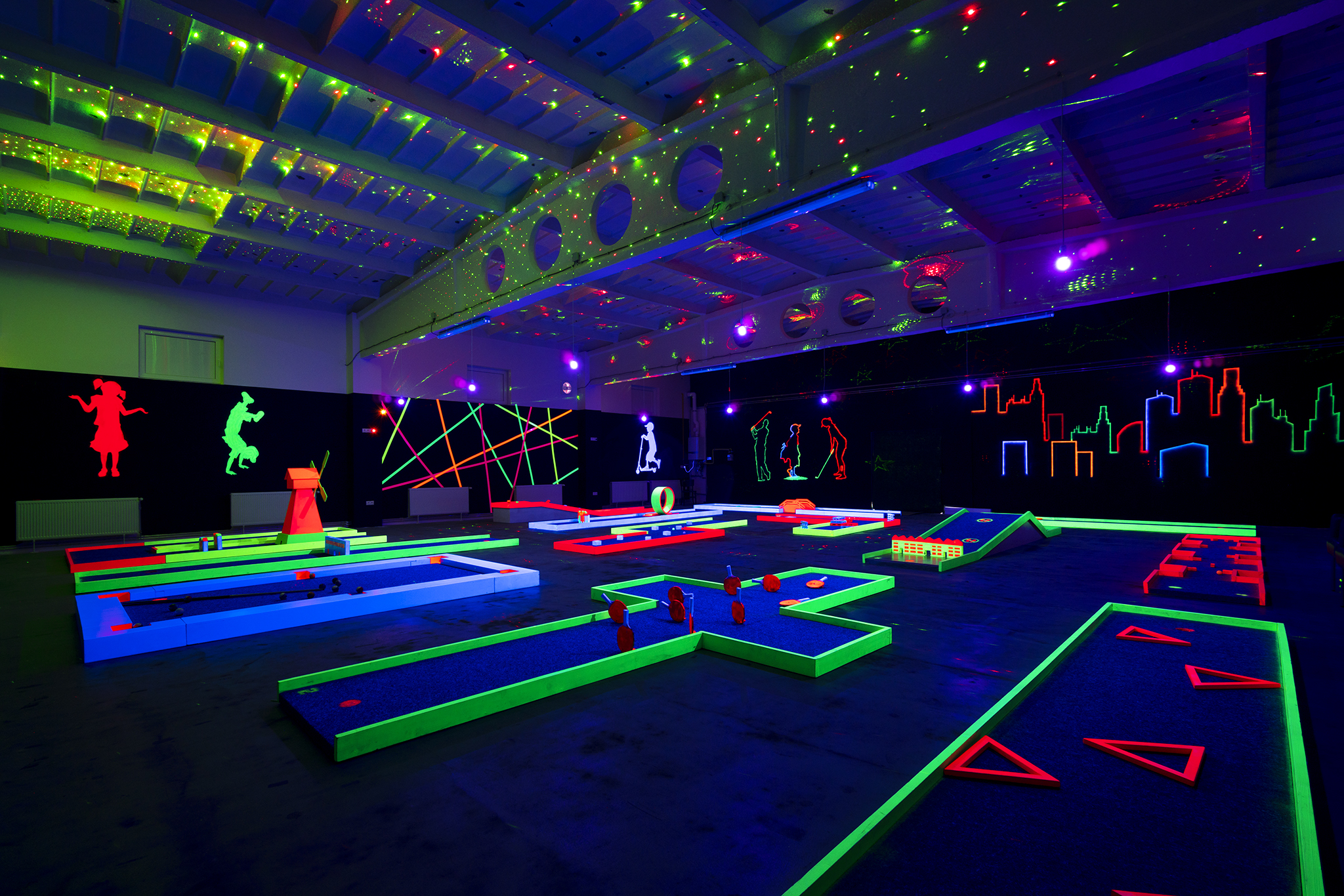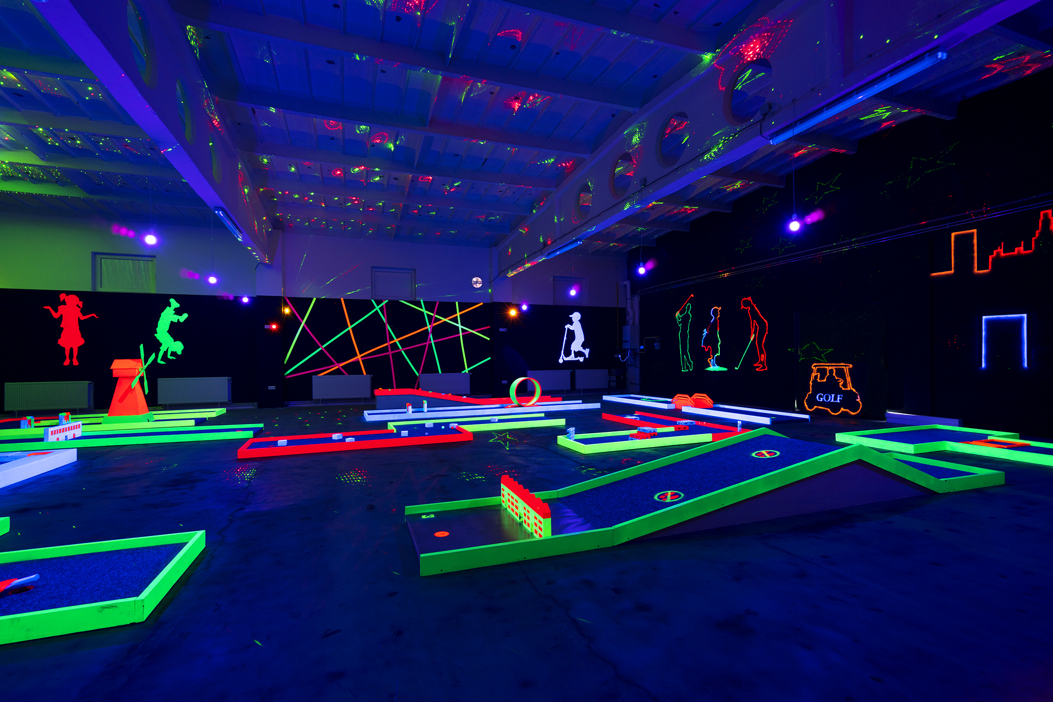 The 13-lane mini-golf course is entirely immersed in darkness, illuminated by UV lights that highlight neon colors on the obstacles, floor, and wall decorations. Mini-golf is available for children from age 7, but it’s also great fun for individuals and groups alike.