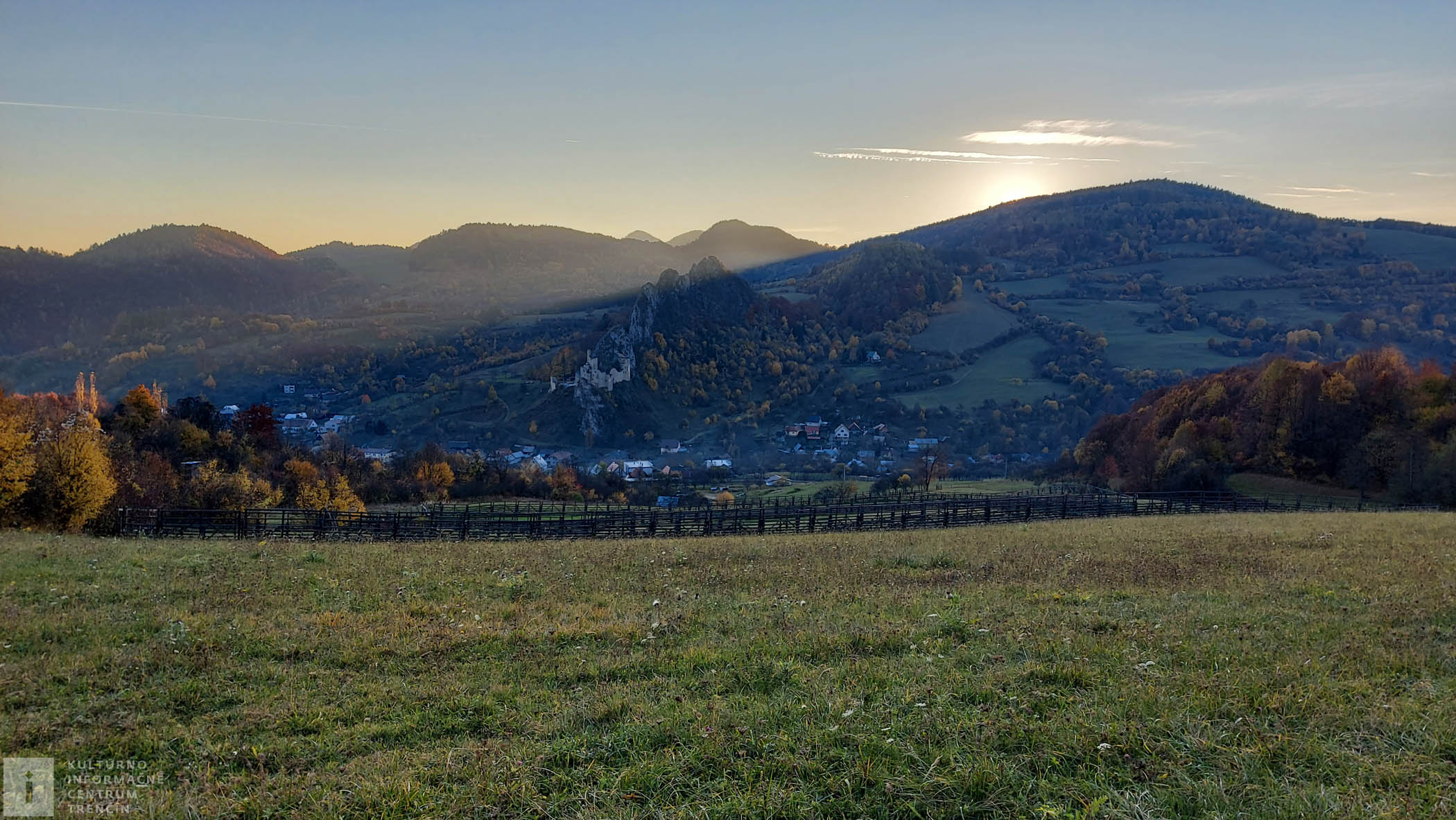 We descend from Lednica Castle down to the village and join the green trail. It leads us along the asphalt road through the village, passing between houses. The path ascends as we approach the viewpoint called Lednické Skalky, located in a protected area. We stick to the marked trail and take care to protect nature. After climbing up, we turn off the field path and cross a meadow until we reach the viewpoint. From there, there is a beautiful view of the village and especially the castle.