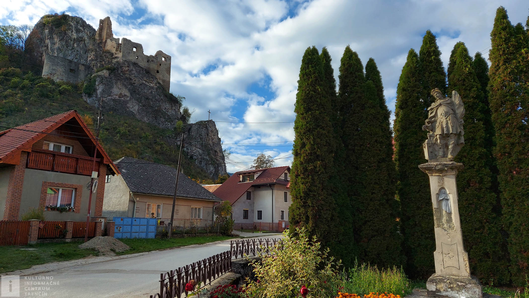 We park our cars in the last available spots at the small parking lot near the municipal office. If there’s no space left, there’s still plenty of room along the road. Above our heads, the historic castle walls rise dramatically from the rock. We’re excited to explore them. Passing by the local pub, we head toward the castle. We stop at Katarínka’s Spring. Next to it is an information board where we can read the legend of the beautiful Katarínka.