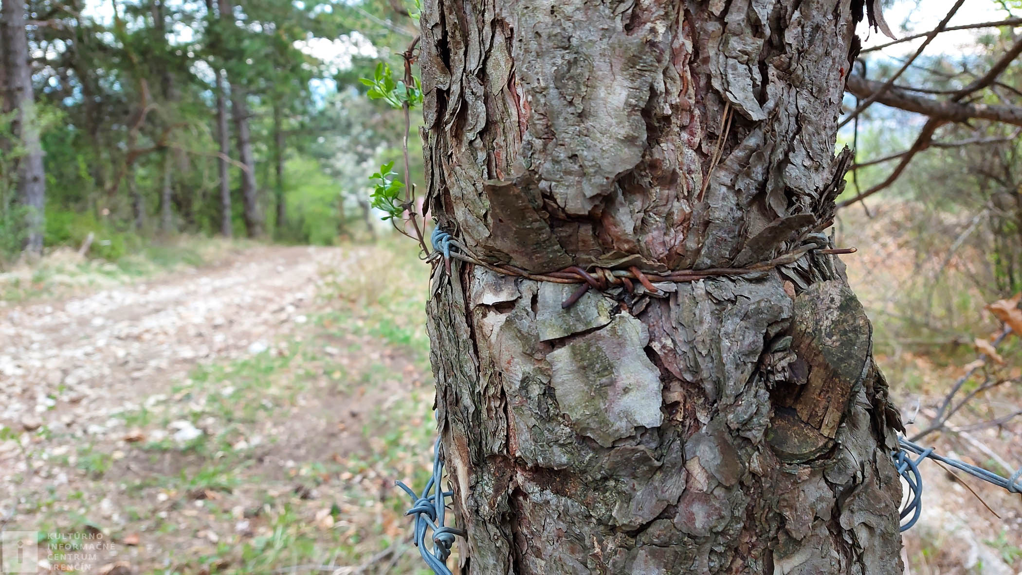 Pokračujeme po žltej značke po poľnej ceste. Okraj kameňolomu je ohraničený trošku necitlivo ostnatým drôtom, ktorý už rokmi zarástol do stromov. Treba byť preto opatrný. Po chvíli odbočujeme vpravo, žltú značku necháme pokračovať svojou cestou a my sa poberáme tou svojou. Vstupujeme do lesa a konečne sa nám mení prostredie, ktoré už nie je nijako poznačené ľudskou činnosťou.