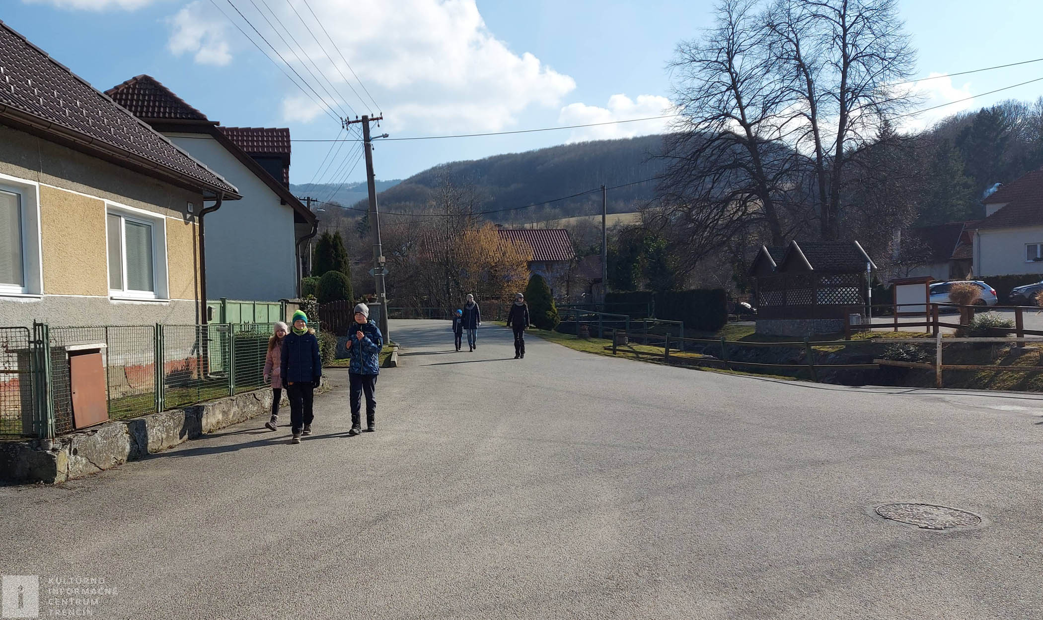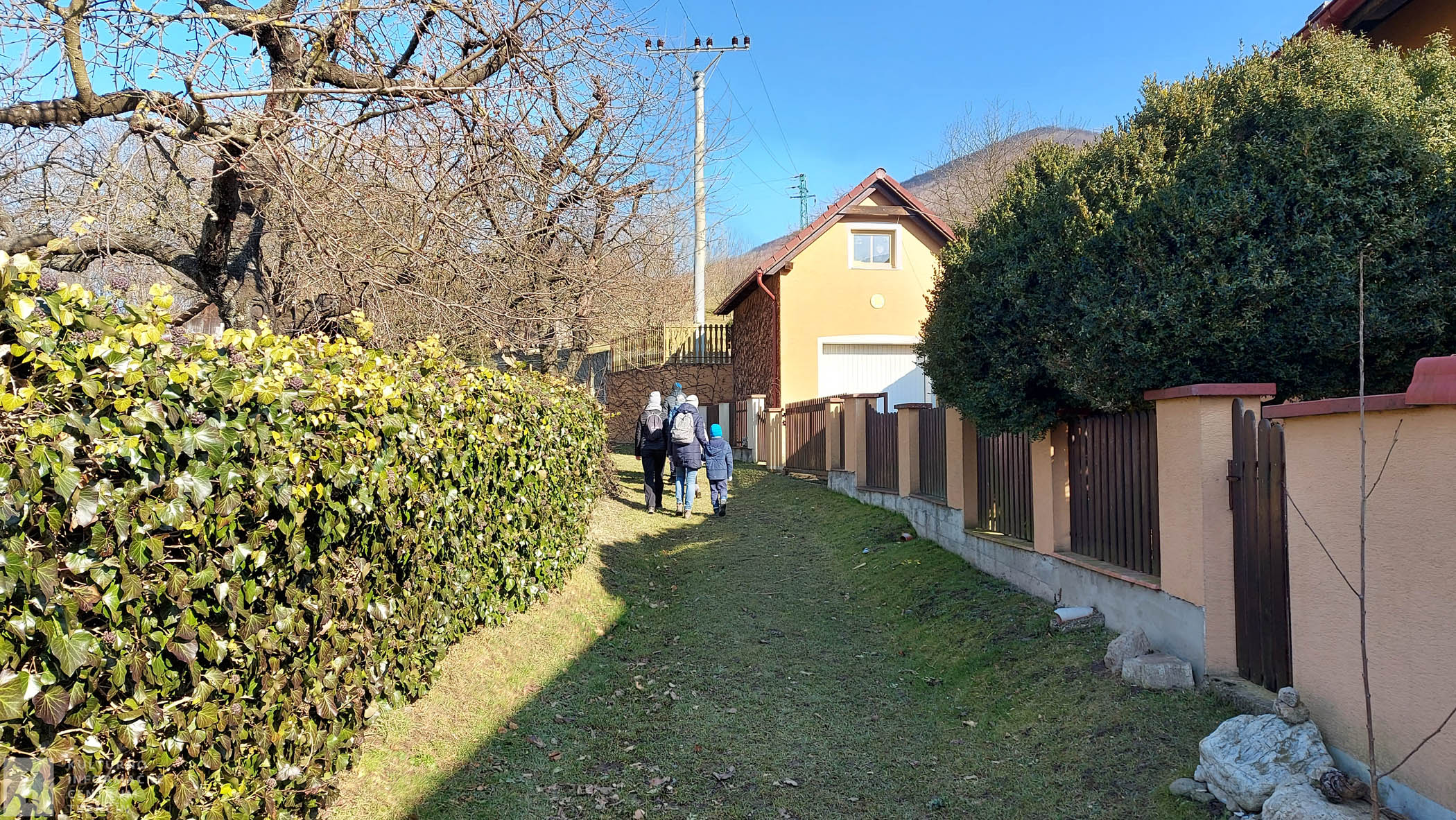 Hneď na začiatku treba dať pozor, kadiaľ máme ísť. Naša cesta vedie od infotabule po moste cez potok a smerom dolu dedinou. Po pár metroch za domom č.99 odbočujeme doprava do úzkej uličky, a po trávičke prejdeme pomedzi domy von za dedinu. Vyšplháme sa z jarku vpravo hore a pokračujeme ďalej okolo stromov.