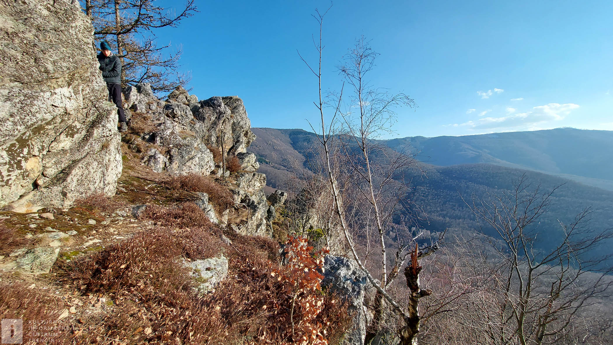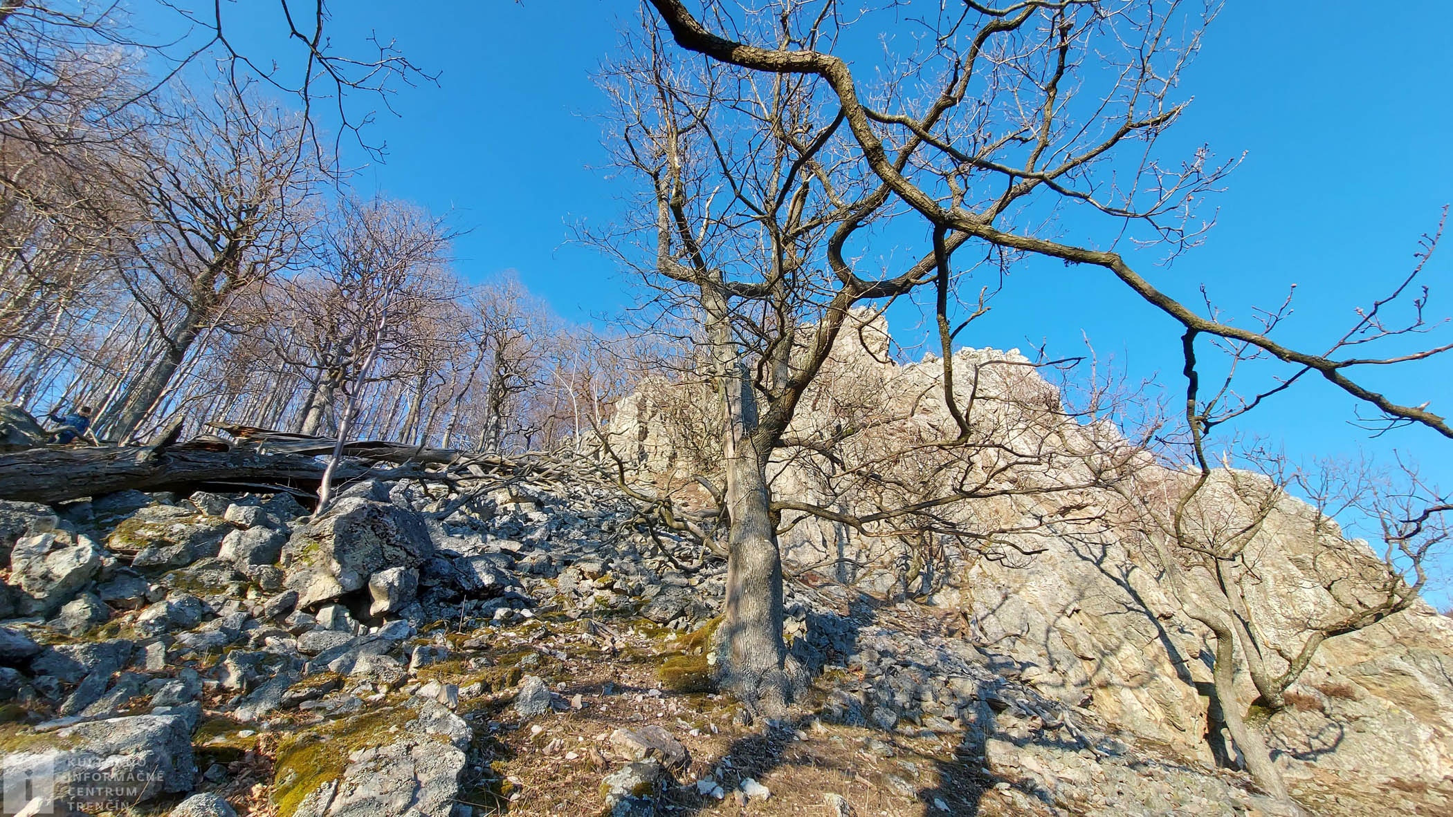 Sledujeme pozorne mapku v navigácii telefónu, kde máme zo značky z chodníka odbočiť na Kamenné more, pretože tam nevedie značená cesta. Ľahko by sa mohlo stať, že by sme skončili až hore na Inovci. Odbočujeme preto na vyvýšenine za kótou. Cesta tu mierne klesá. Po divokom lese sa prebojujeme cez popadané stromy a skaly až ku miestu, kde sme sa dnes chceli dostať.