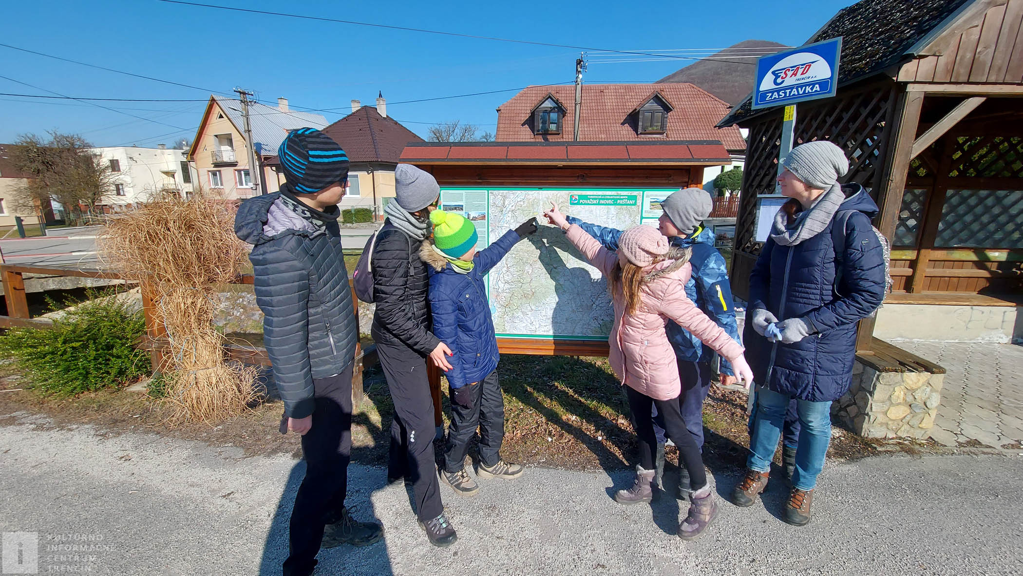 Rýchlo sa dolu kopcom po vyšliapanom lesnom chodníku dostávame až ku vleku. Pokračujeme po inej ceste, akou sme išli hore. Zídeme tento krát dolu po zjazdovke. Je krásne upravená a pokosená. Moc sa nerozbiehame, lebo asi v polovici lyžiarskeho kopca po vyšliapanom chodníčku odbočujeme doľava, aby sme obišli domy na okraji dediny a dostali sa na cestu. Darí sa nám to a chodníčkom okolo vodného zdroja sa dostaneme na cestu, po ktorej prejdeme do dediny a okolo potoka až k našim autám.