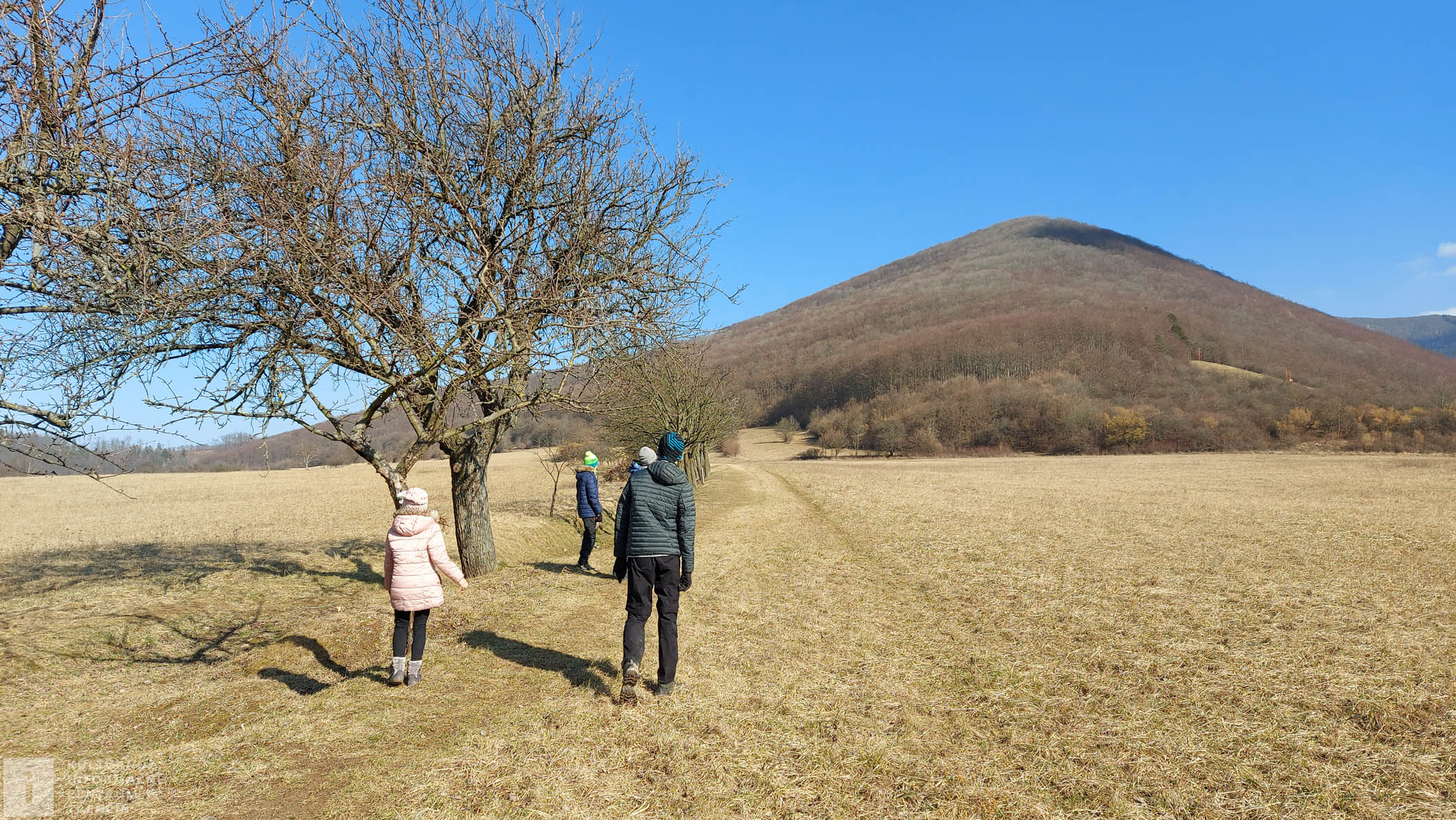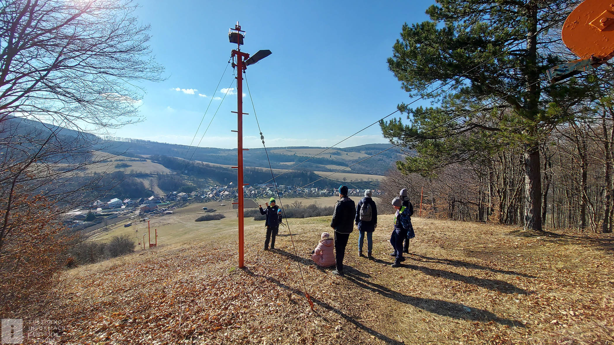 Rad ovocných stromov nás sprevádza až po horu. Na konci sadu odbočujeme vpravo a začíname stúpať po mierne naklonenej „rovinke“ – čiže do mierneho kopca. Prichádzame ku vrchnej stanici lyžiarskeho vleku. Všímame si, že je tu celkom fajn kopec na lyžovanie a sánkovanie – v zime sa sem určite prídeme pozrieť. Trošku si odpočinieme a ideme ďalej. Cesta sa tu rozbieha na viaceré smery, my si vyberáme ten správny a po turistickej značke ideme do kopca.