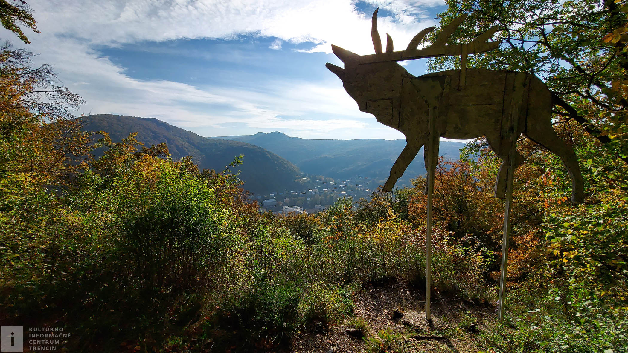 Hneď nad jaskyňou je prvý z cieľov dnešného výletu – turistický prístrešok a vedľa neho stojaci biely jeleň. Krásne vyhliadkové miesto, odkiaľ možno pozorovať Teplice. S jeleňom je spojená zaujímavá povesť o miestnom krutom panovníkovi a jeho krásnej manželke. Všetko sa dá dočítať na infopaneli vedľa prístrešku.