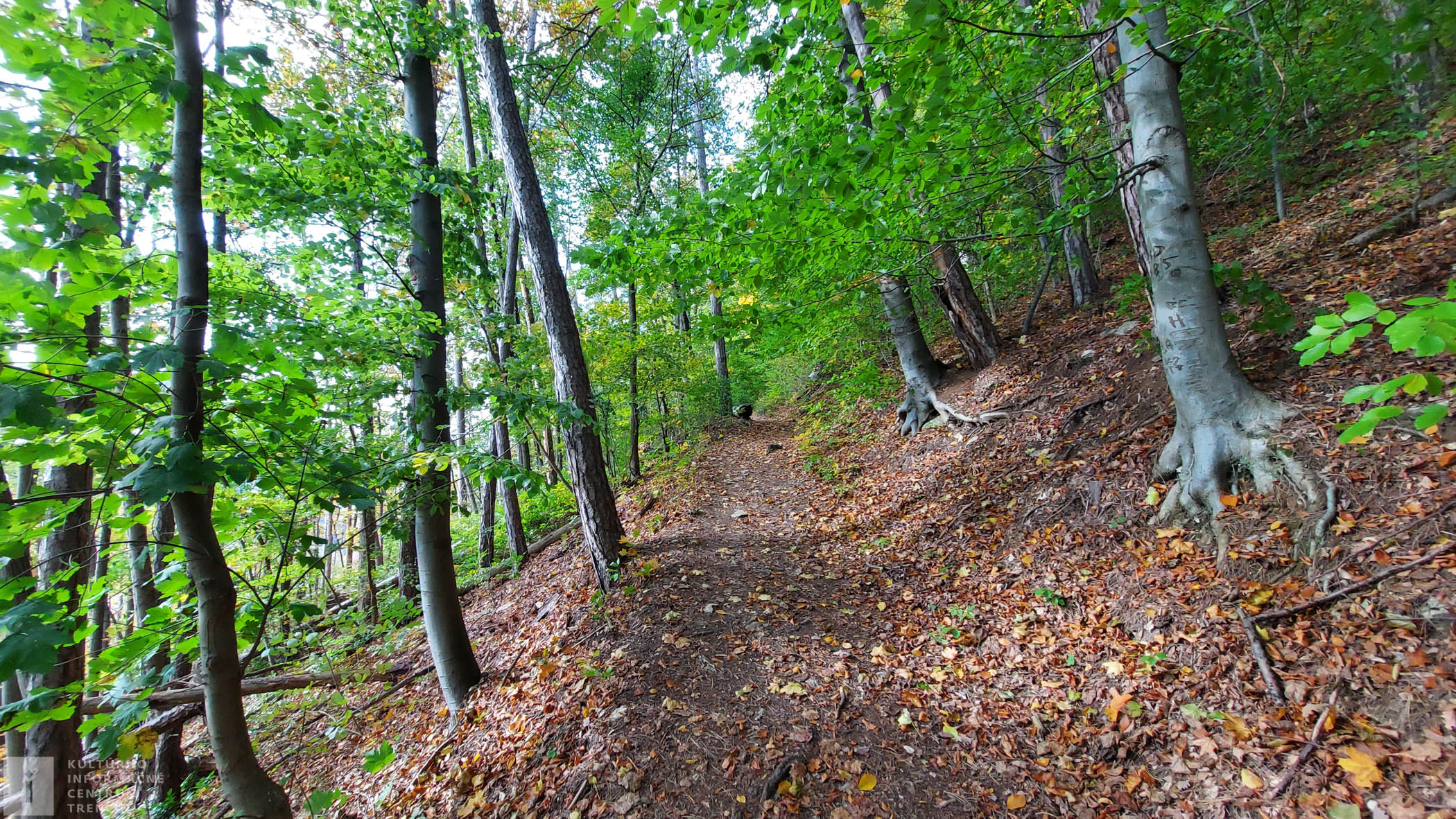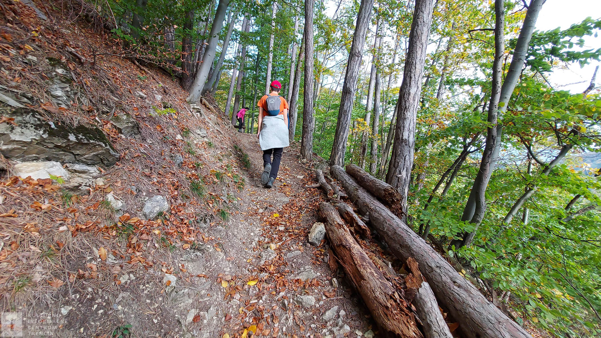Úzky chodník stúpa po serpentínach nahor a my pekne naberáme výšku. Sem tam musíme prekonávať aj prekážky vo forme popadaných stromov, čo ale nie je problém. Aj sa čudujeme, že kúpeľní hostia zvládnu túto cestu. Možno vtedy, keď sú už vyliečení :-). Sú tu rozmiestnené drevené lavičky, takže je si kde oddýchnuť a načerpať sily. Dokonca natrafíme po chvíli aj na pekný altán. Dáme si malú prestávku a pokračujeme ďalej. Musíme si dávať pozor, lebo je tu množstvo značených chodníčkov, aby sme zle neodbočili. Držíme sa klasickej zelenej turistickej značky.