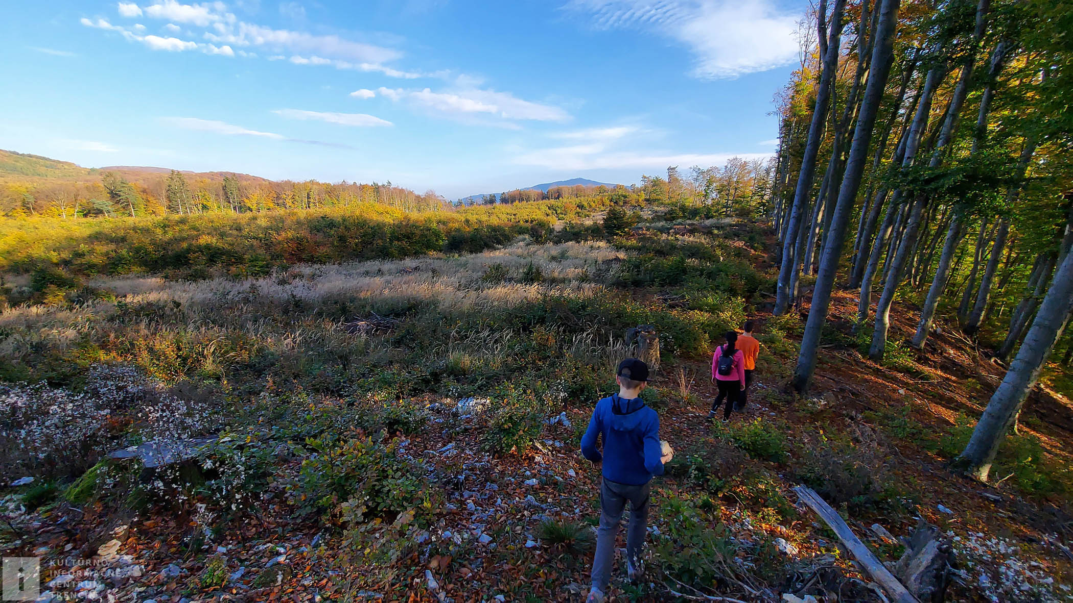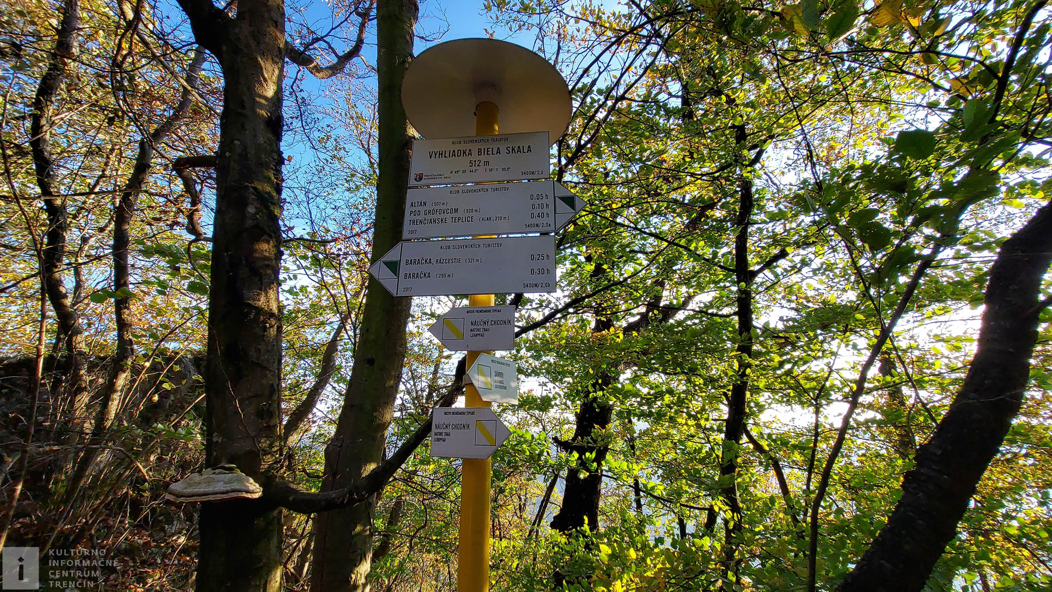 Prichádzame k vyhliadke Biela skala. Toto miesto je druhým dnešným cieľom výletu. Je tu znovu vybudované pekné kryté posedenie a máme odtiaľto fajn výhľad do diaľav. Ideálne je absolvovať tento výlet na jeseň v poobedňajšom čase, aby slniečko na nás príjemne svietilo.