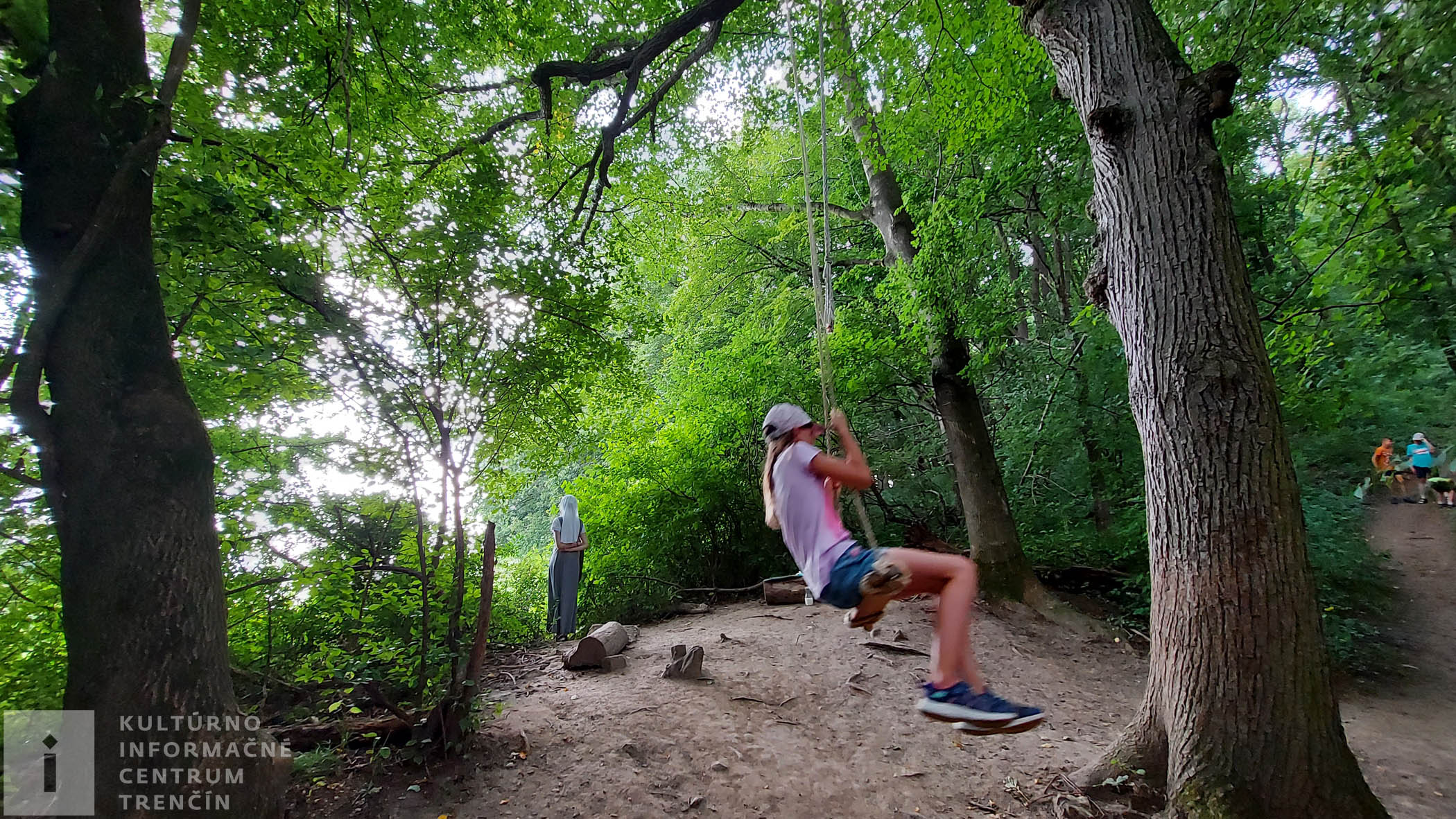 Na konci krížovej cesty pokračuje trasa náučného chodníka po vyšliapanej cestičke, vďaka čomu nemáme obavy, že by sme mohli zablúdiť. Prichádzame k hojdačke, ktorú vraj stráži anjel. Máme šťastie, pretože anjel tu teraz je (pozri foto) – naše deti sa tak môžu bezpečne odhúpať a pokračovať ďalej.