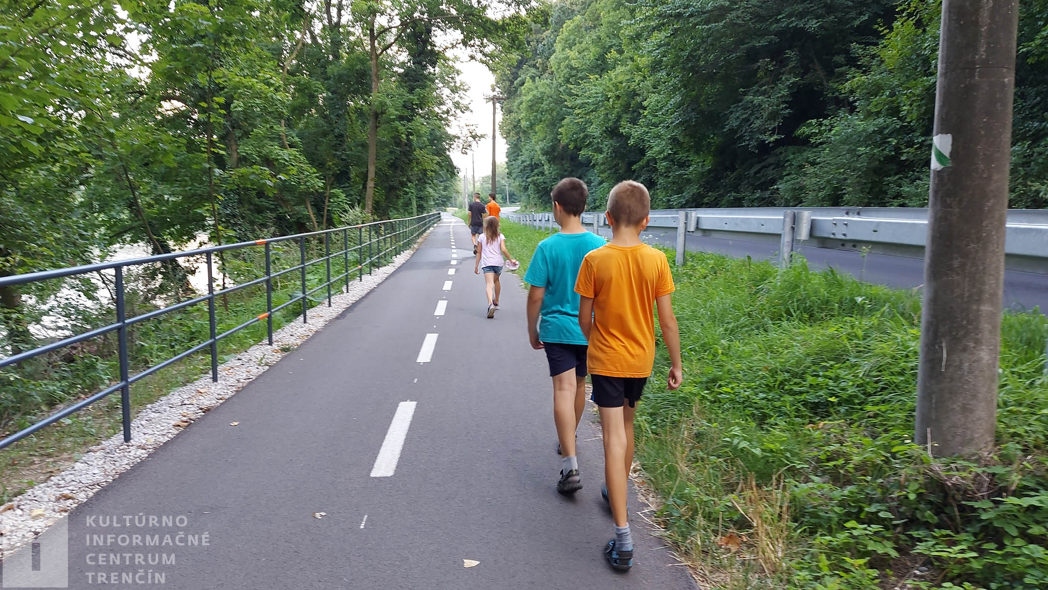 Čaká nás presun na miesto začiatku nášho výletu. Nepôjdeme po ceste, chodia tu často autá. Prejdeme bližšie ku Váhu a ideme po cyklotrase. Aby to bolo bezpečné pre nás aj cyklistov, ideme po kraji a za sebou. Akonáhle máme možnosť, opúšťame chodník pre cyklistov a pokračujeme po prašnej cestičke.