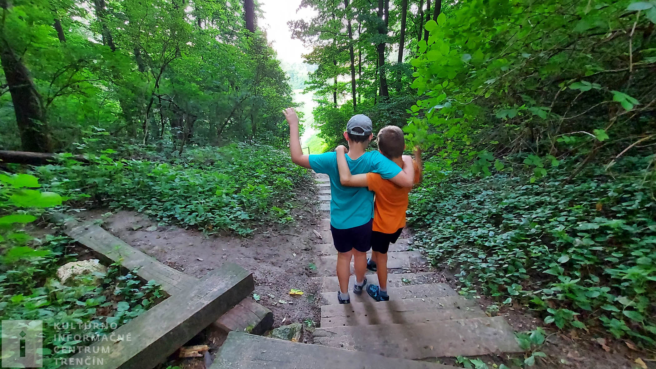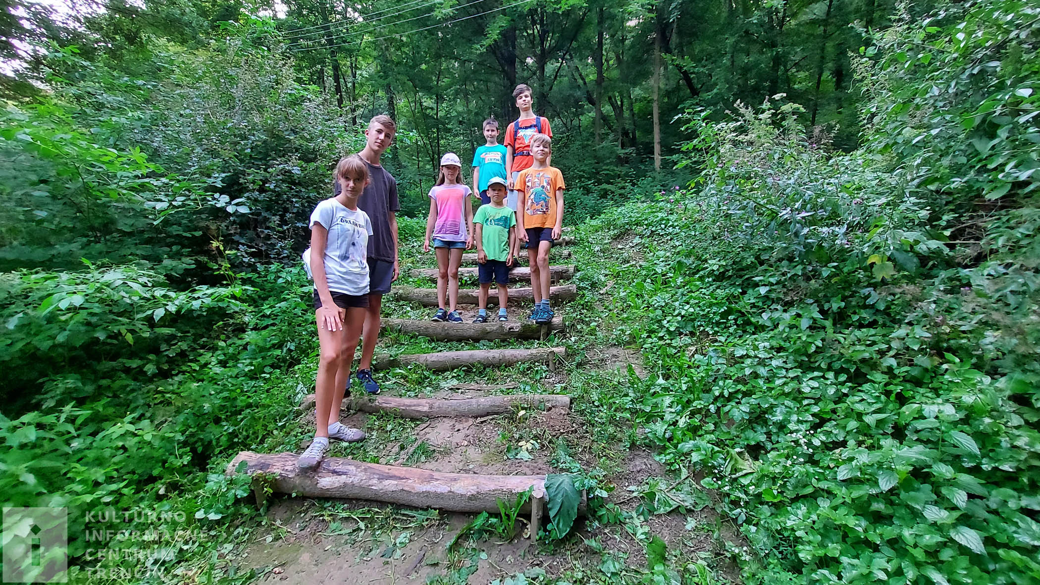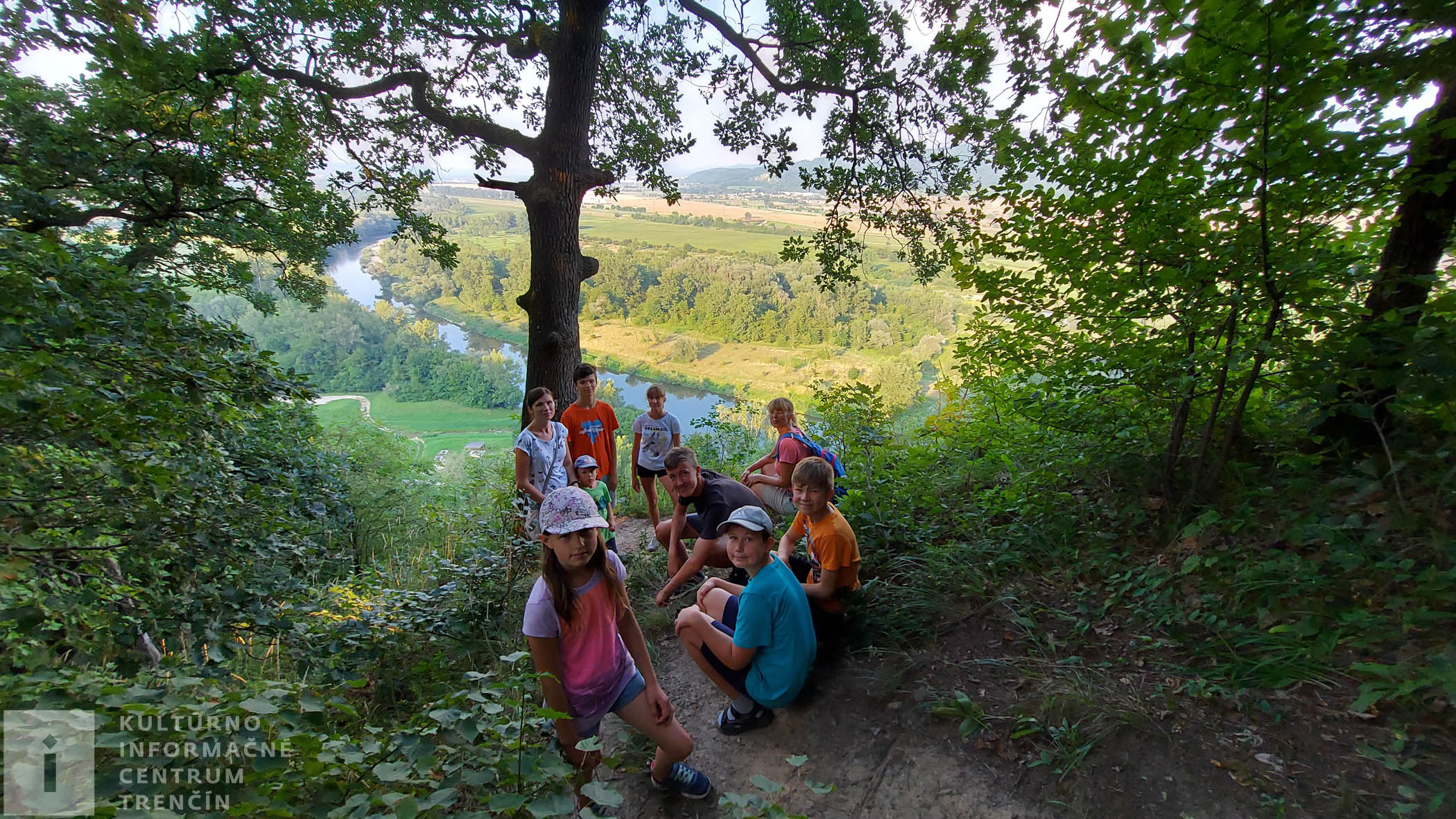 Prichádzame k informačnej tabuli, kde sa cesty rozdvojujú. Doľava pokračuje náučný chodník. My však odbočujeme doprava a ideme si obzrieť vyhliadku, z ktorej je krásne vidno našu rodnú rieku Váh, blízke obce a mestá. Je potrebné, aby na tejto odbočke ku vyhliadke, dali rodičia pozor na deti (aj na seba), pretože terén je prudký a vyhliadka je na okraji priepasti.