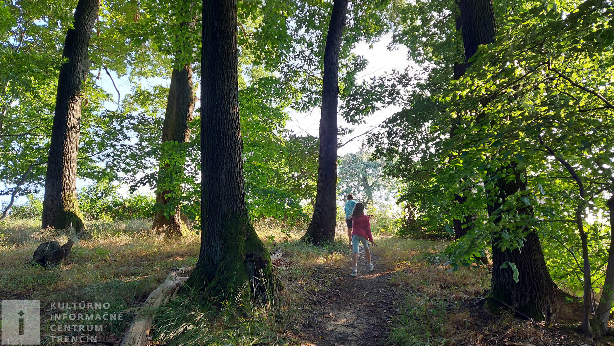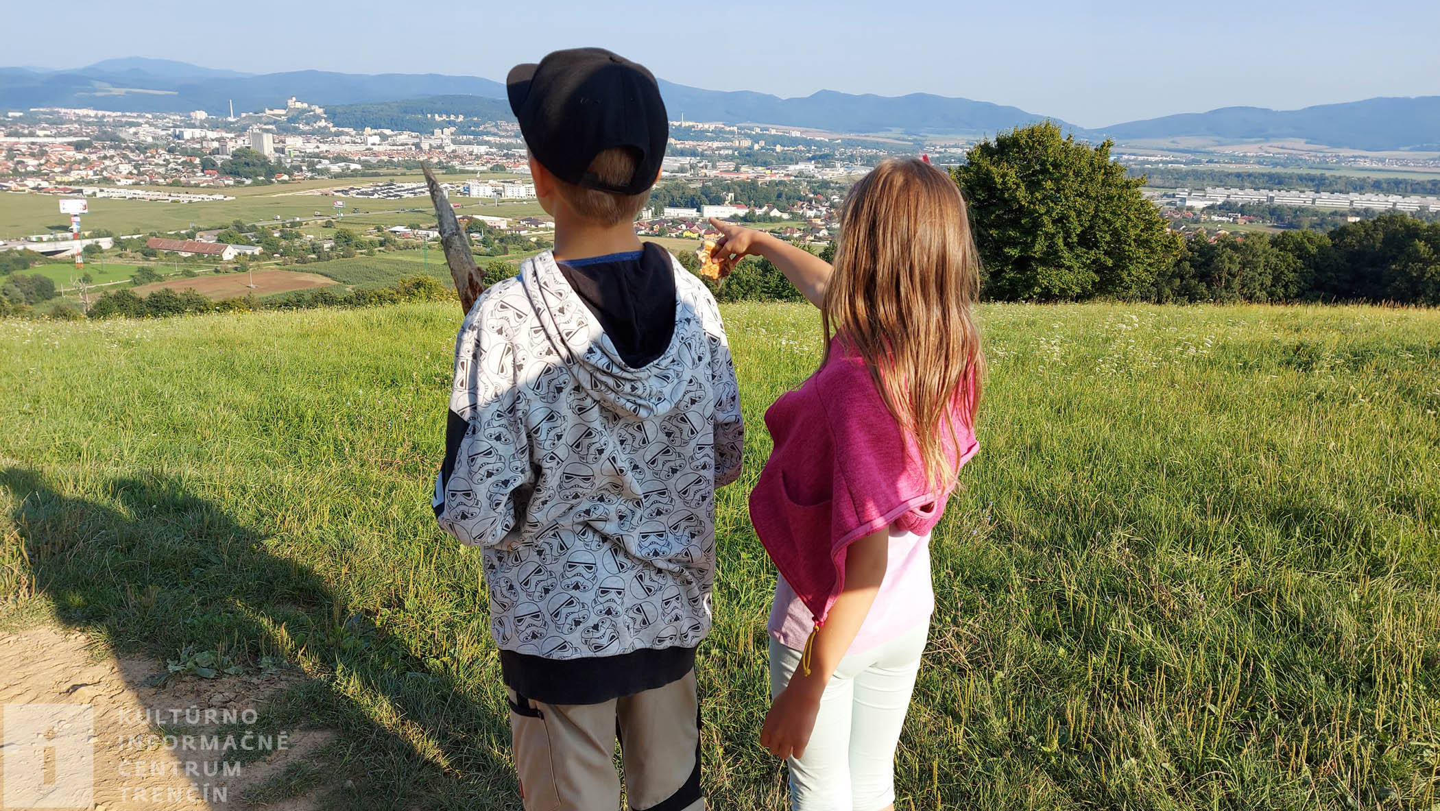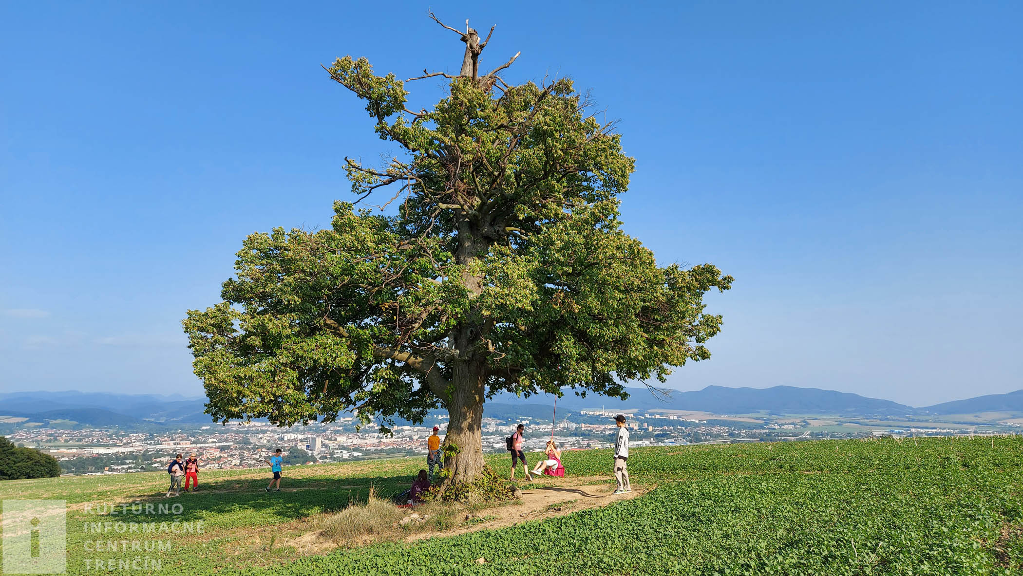 Pod stromom visí hojdačka, perfektná atrakcia pre decká. Dosýta sa vyšantíme a ideme naspäť. Užívame si neskutočné výhľady na Trenčín. Celé naše mesto je odtiaľto ako na dlani. Pri lese odbočujeme doprava – nepokračujeme lesom ku kyselke, ale jeho okrajom zídeme dolu kopcom po poľnej ceste až k diaľnici.