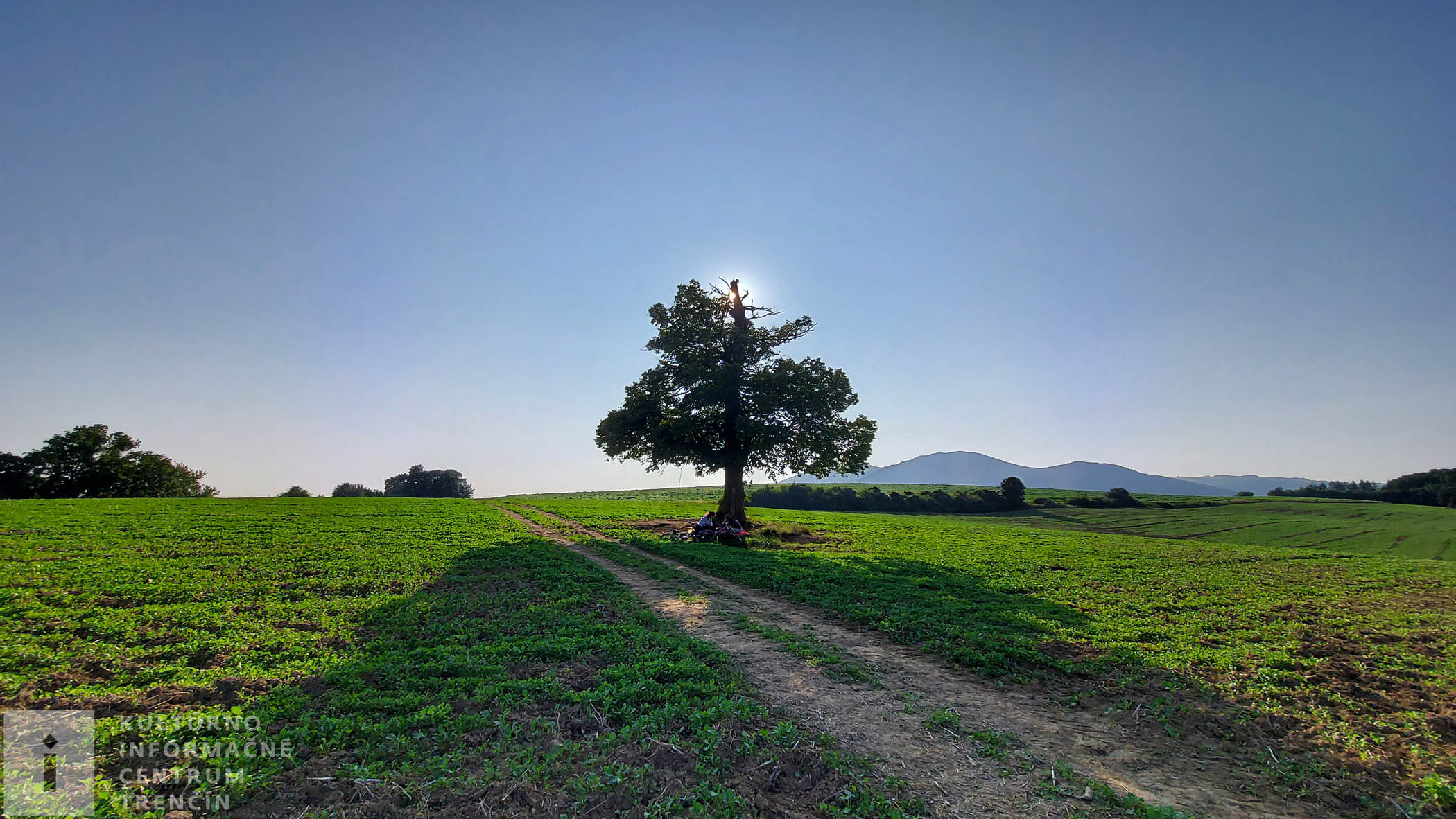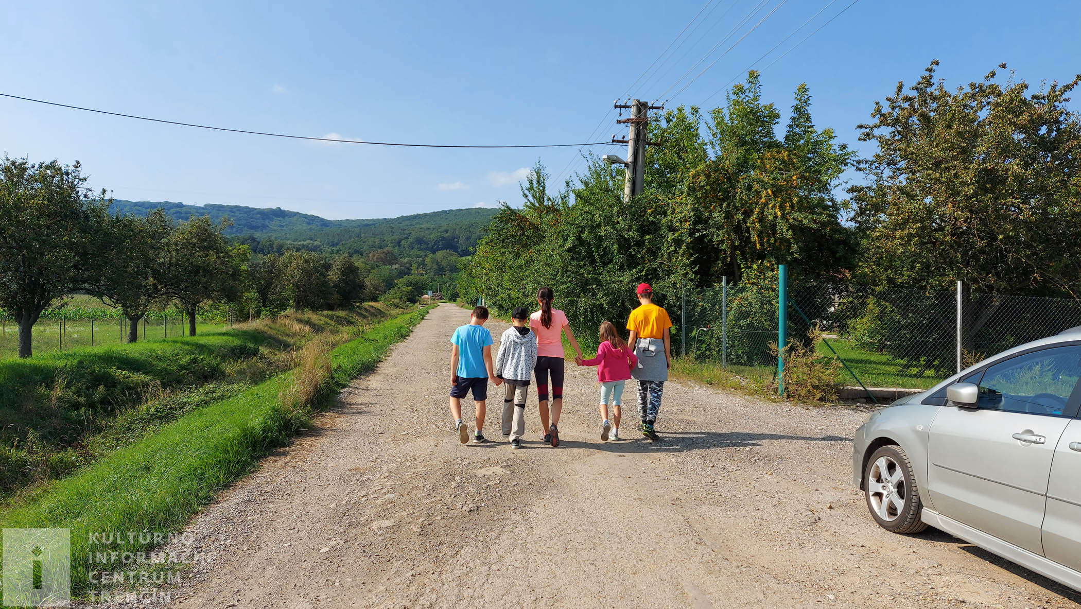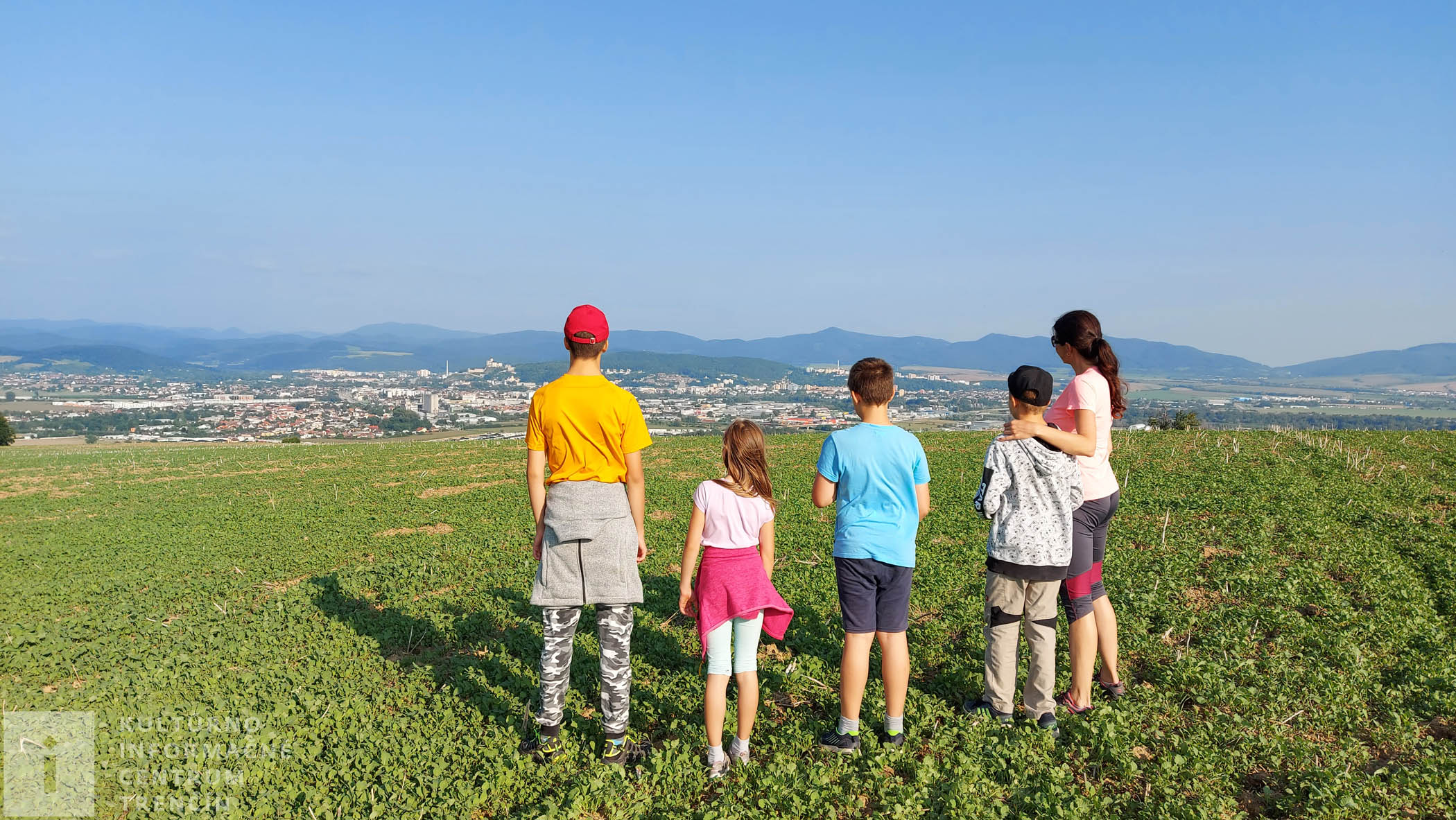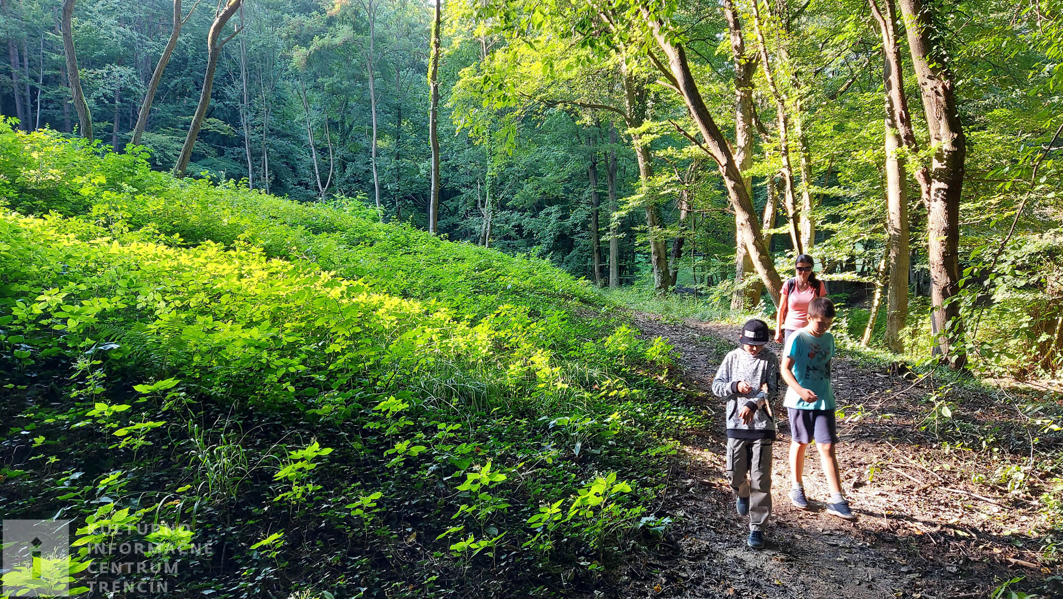 Pod stromom visí hojdačka, perfektná atrakcia pre decká. Dosýta sa vyšantíme a ideme naspäť. Užívame si neskutočné výhľady na Trenčín. Celé naše mesto je odtiaľto ako na dlani. Pri lese odbočujeme doprava – nepokračujeme lesom ku kyselke, ale jeho okrajom zídeme dolu kopcom po poľnej ceste až k diaľnici.