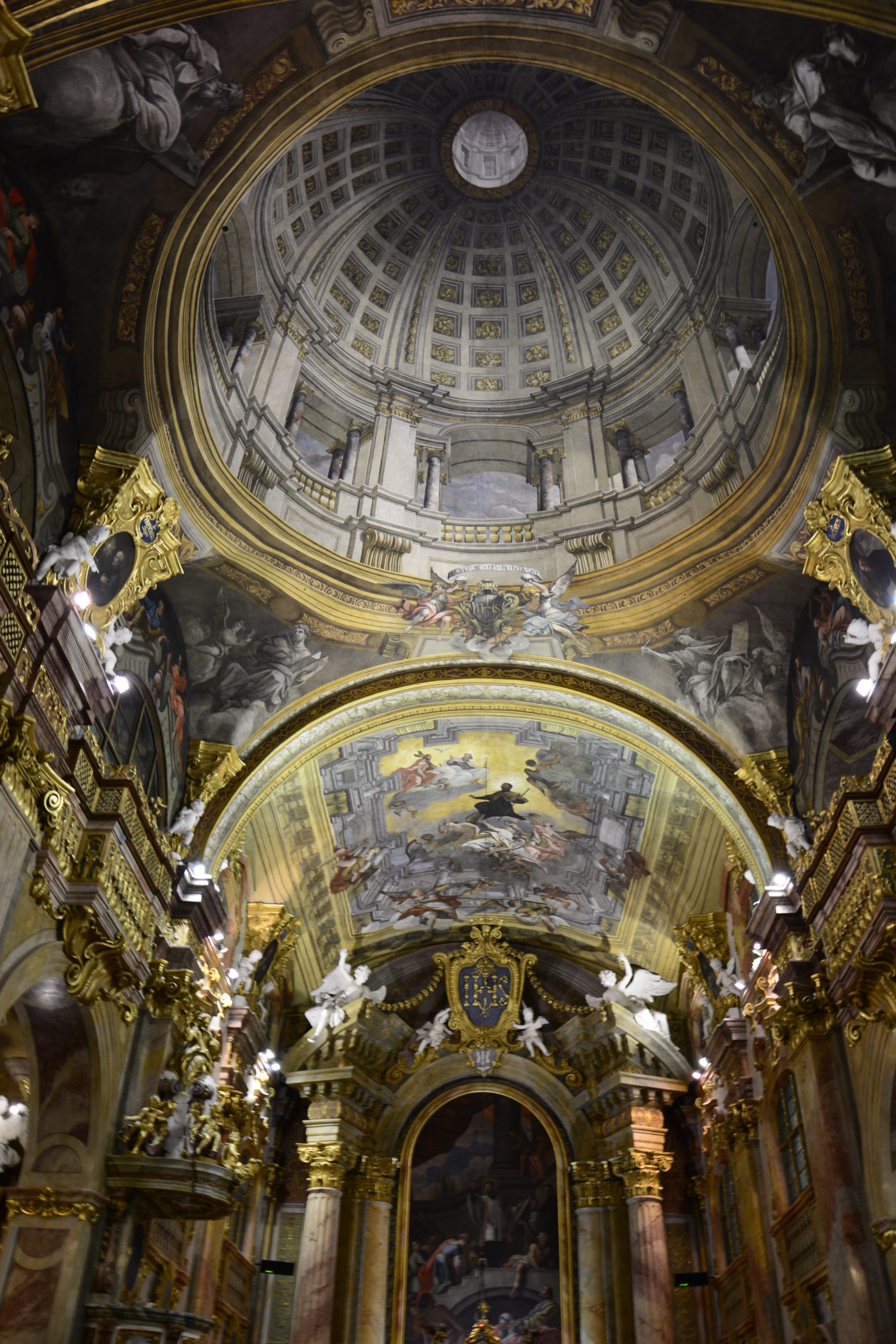 Nástropné maľby sa viažu k životu sv. Františka Xaverského, patrónovi kostola i mesta Trenčín. Maľba nad presbytériom znázorňuje svätca neseného anjelmi k Najsvätejšej Trojici, ktorá ho prijíma do nebeskej slávy. V poli nad hudobnou emporou (tzv. chórus) je zobrazený sv. František Xaverský ako misionár, žehnajúci kňaz a kazateľ, vznášajúci sa na oblakoch medzi anjelmi. V pravom dolnom rohu je personifikácia štyroch svetadielov, symbolizujúca svetovú misiu Spoločnosti Ježišovej: žena s kvetmi (Európa), žena na ťave (Ázia), černoška s rohmi hojnosti (Afrika) a žena s palmovou ratolesťou (Amerika).