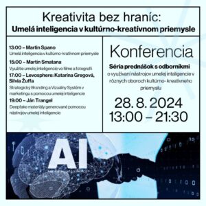 Chceš vedieť aké sú najnovšie trendy a nástroje umelej inteligencie využívané v oblasti kultúrno-kreatívneho priemyslu, fotografie, videa, alebo marketingu? Príď na jednodňovú konferenciu, prednášky a diskusiu o umelej inteligencii s najväčšími kapacitami vo svojich oboroch. 28. 8. 2024 od 13:00 v Kultúrno-kreatívnom centre Hviezda v Trenčíne!