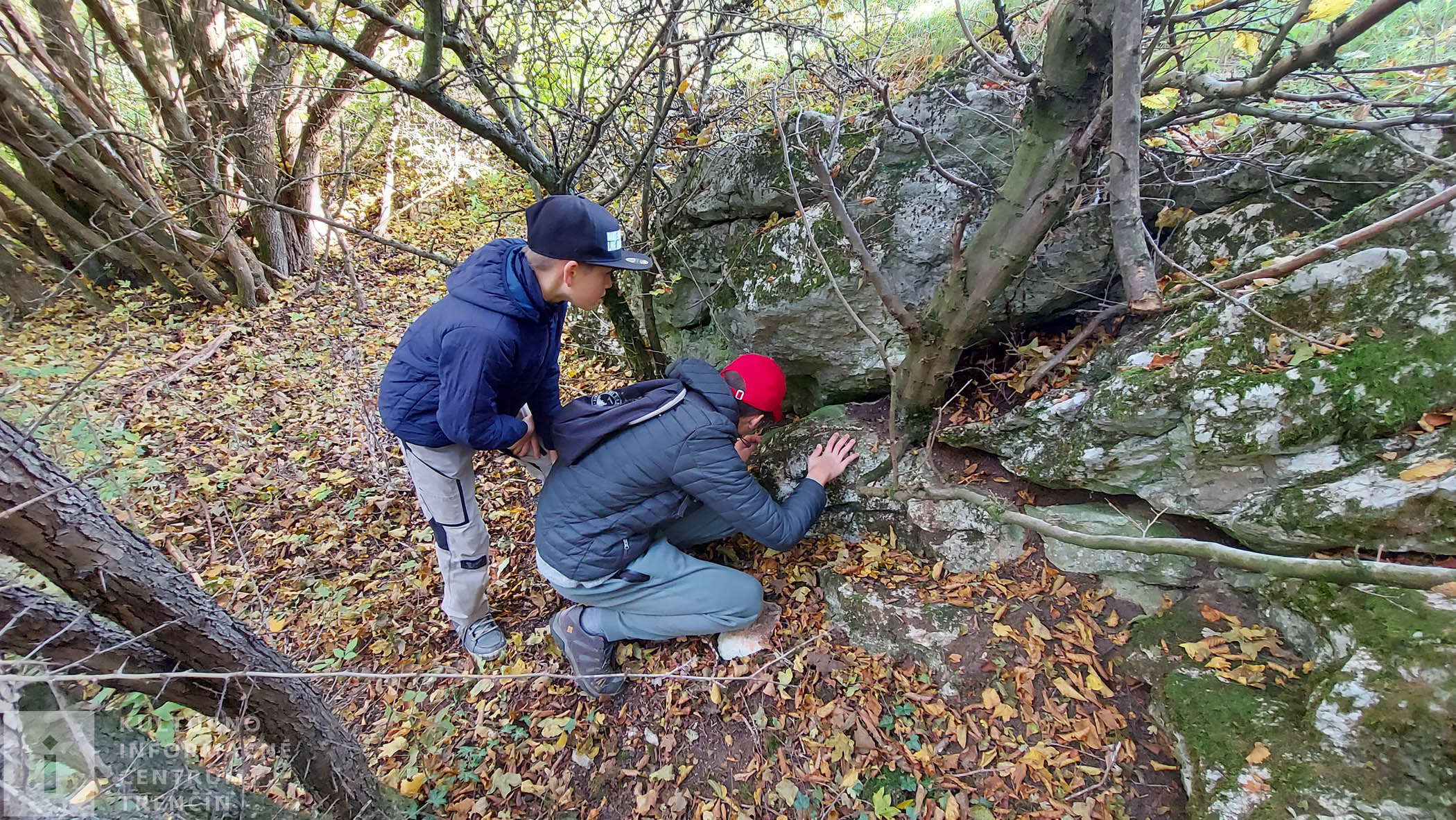 Pravdepodobne ich tu pred 25 rokmi zanechali archeológovia pri výskume. Hradisko je doposiaľ rozkopané. Musíme si dávať veľký pozor, pretože je tu veľmi veľa jám, do ktorých by sme mohli ľahko spadnúť. V čase nášho skúmania je všade veľa lístia. To zakrýva jamy – vyzerajú ako pasce pre neželaných návštevníkov, ktorí rušia pokoj tu pochovaných.