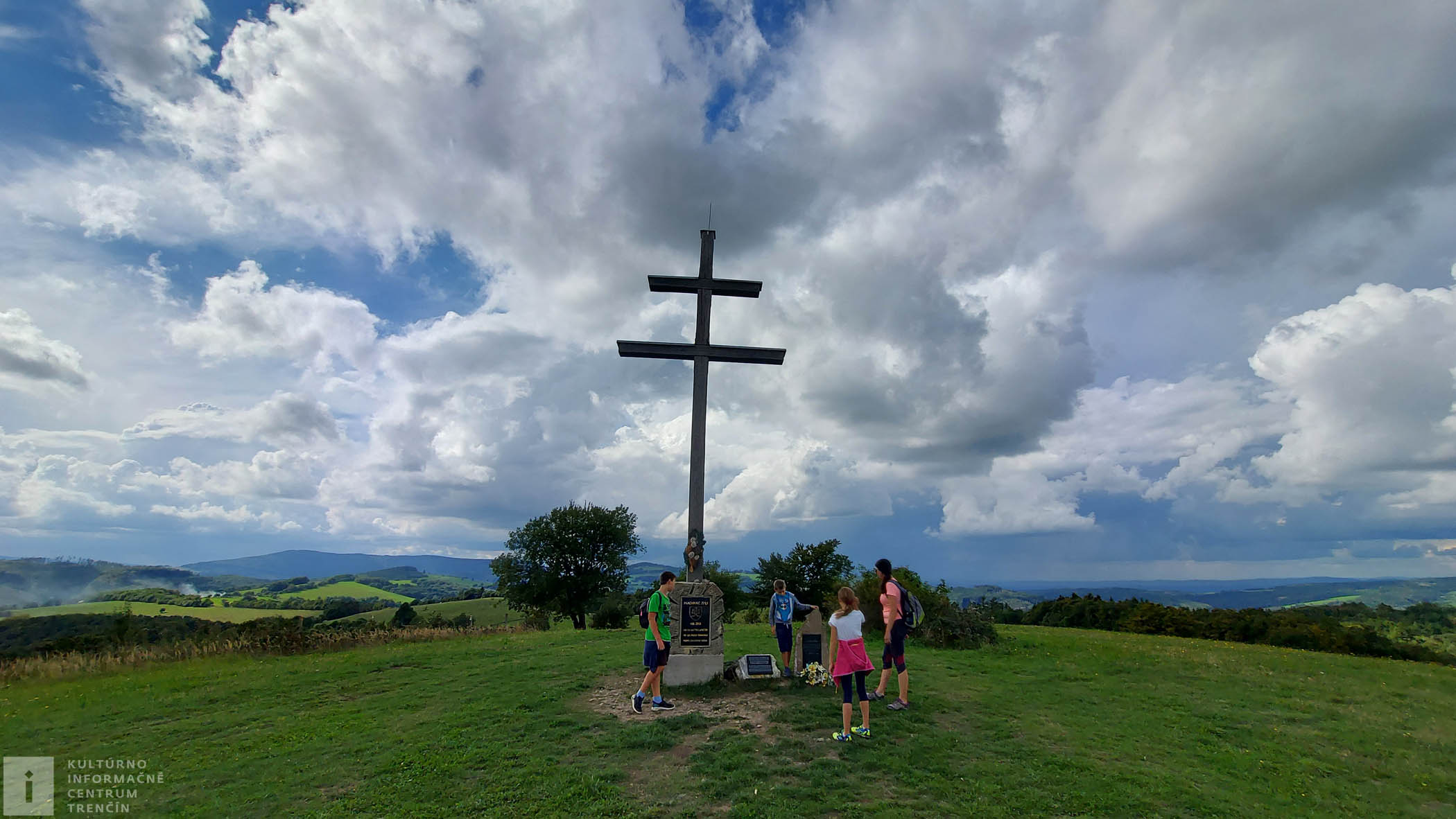 Po chvíli prichádzame ku krížu. Sme na najvyššom mieste dnešného výletu. Vrchol Machnáču je vysoký 771 metrov a je odtiaľto úžasný výhľad na Trenčín a na široké okolie. Dávame si malú prestávku, posilníme sa keksíkom a čajom. Dnes tu našťastie nefúka vietor, ktorý tu vie byť niekedy veľmi silný.